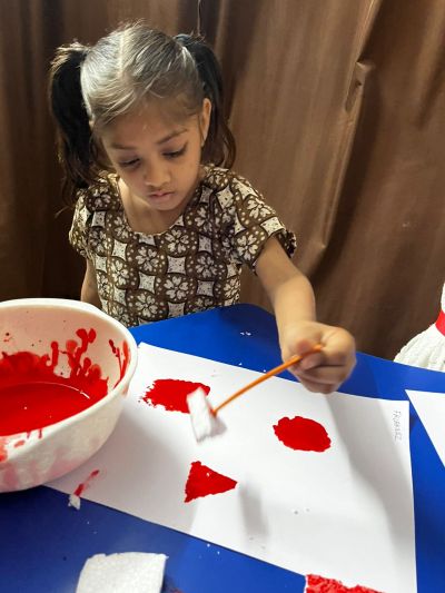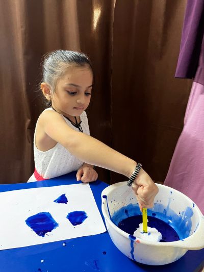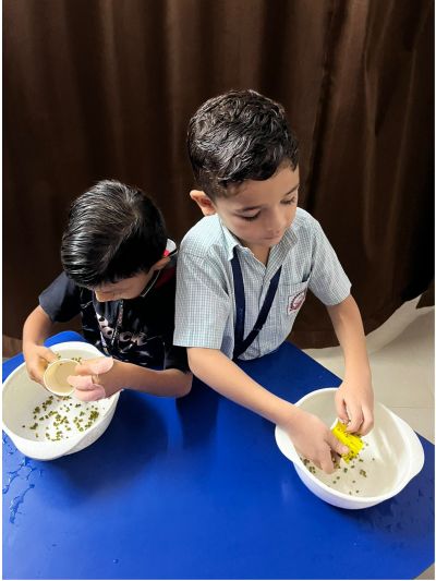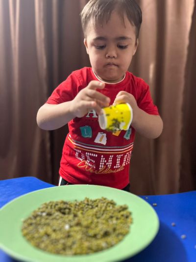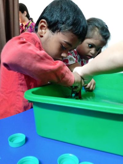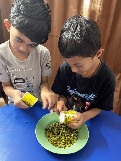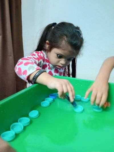 In today's therapy session, the students engaged in a series of interactive activities designed to develop their fine motor skills and cognitive abilities. The first activity involved using clips to pick up caps from a tub filled with water, enhancing their grip and hand-eye coordination. In the second activity, students placed shape cutouts into coloured bowls and then arranged them on paper, working on shape recognition and colour matching. The final task challenged the children to remove beans stuck to a glass, improving their concentration and precision.