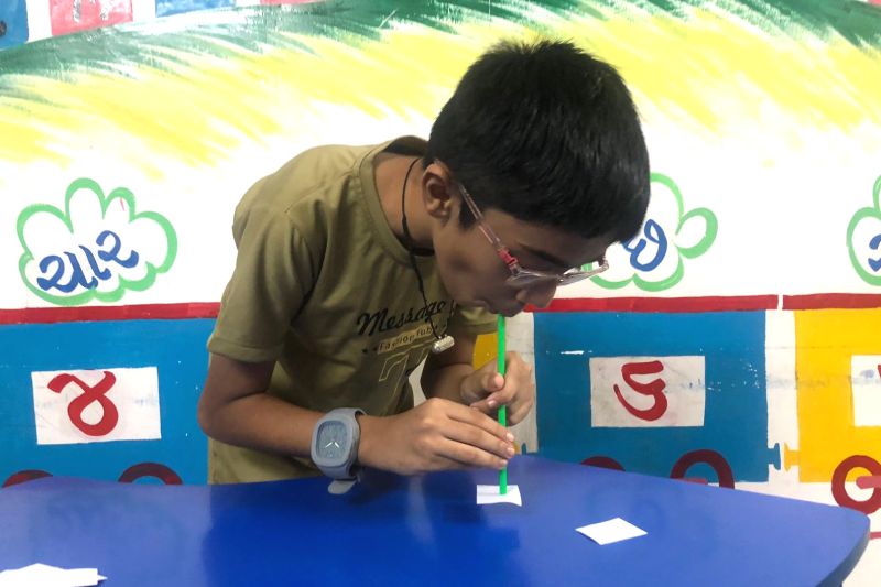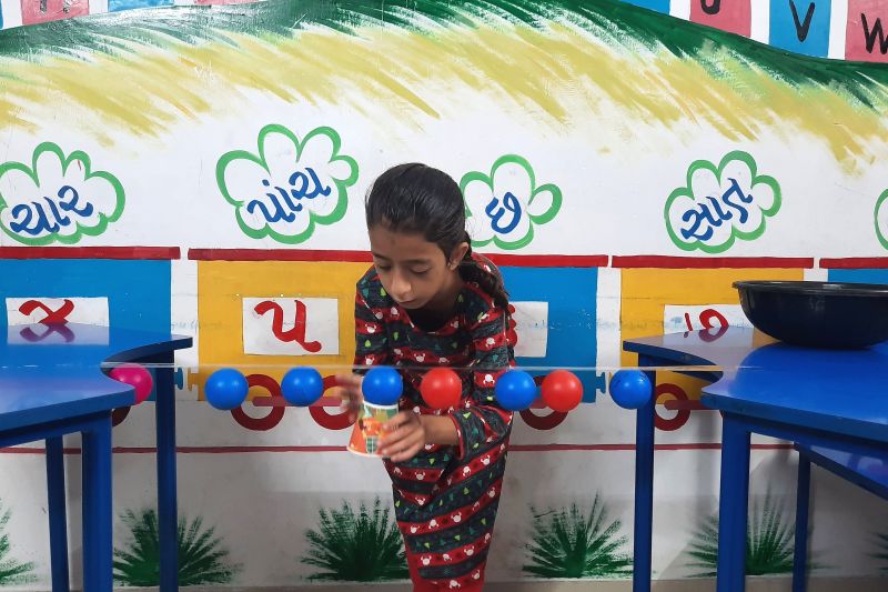 In activity, students participated in three engaging tasks that promoted both creativity and coordination. In the first activity, each student used a straw to pull a paper across the bench, strengthening their breath control and focus. The second activity involved balancing a ball with an upside-down glass on a piece of cellophane tape stretched between two benches, testing their patience and precision. In the third task, a corn outline was placed on a sheet, and students dipped their fingers in coloured bowls, filling the corn by placing their fingerprints within the outline—an artistic exercise that combined creativity with fine motor control.
